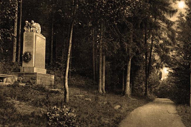 Around 1924 - In the Municipal Forest a monument was erected opposite the shooting range, on the other side of the largest pond, to the fallen German soldiers of the 82nd Field Artillery Regiment. The author of the monument was Georg Fung, an artist from Pieniężno. The monument depicts the figures of two crouching artillerymen, who are placed on a high pedestal.